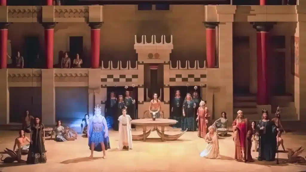 Idiomeneusz, nem csak hogy részt vett a Trójai háborúban, hanem az egyik legnagyobb hajóhadat adta a hadjárathoz. 80 sudár gályával csatlakozott a több mint ezer hajóból álló hatalmas flottához, mely Trója bevételére indult. Egyike volt annak a kilenc hősnek aki kész volt Hektórral párviadalt vívni. Egyike a Trójai falóban helyet foglaló harcosoknak. Mozart 1781-ben Münchenben mutatta be 3 felvonásos operáját az Idomeneo-t, melyet egyúttal élete főművének is tartott. A mű színpadra állítása napjainkban is hatalmas technikai és művészeti kihívás, mivel tekintélyes színpadi apparátust, többek között nagy létszámú kórus részvételét követeli meg. A mű főszereplője értelemszerűen Idomeneusz Krétai király. Az alábbi képek a San Jose Opera előadásán készültek. A színpadon a mínoszi kor legbecsesebb emlékei jelennek meg. Többnyire a Knossosi palota freskóit, a palota korhűen rekonstruált belső tereit álmodták díszletnek. Merítettek ugyanakkor a díszlettervezők a Santorini szigetén feltárt ősi Akrotiri városának leletei közül is, igy a csodás flotilla freskó, és a tavasz freskó könnyed elegáns szépsége ad hátteret ennek a fantasztikus opera előadásnak.
